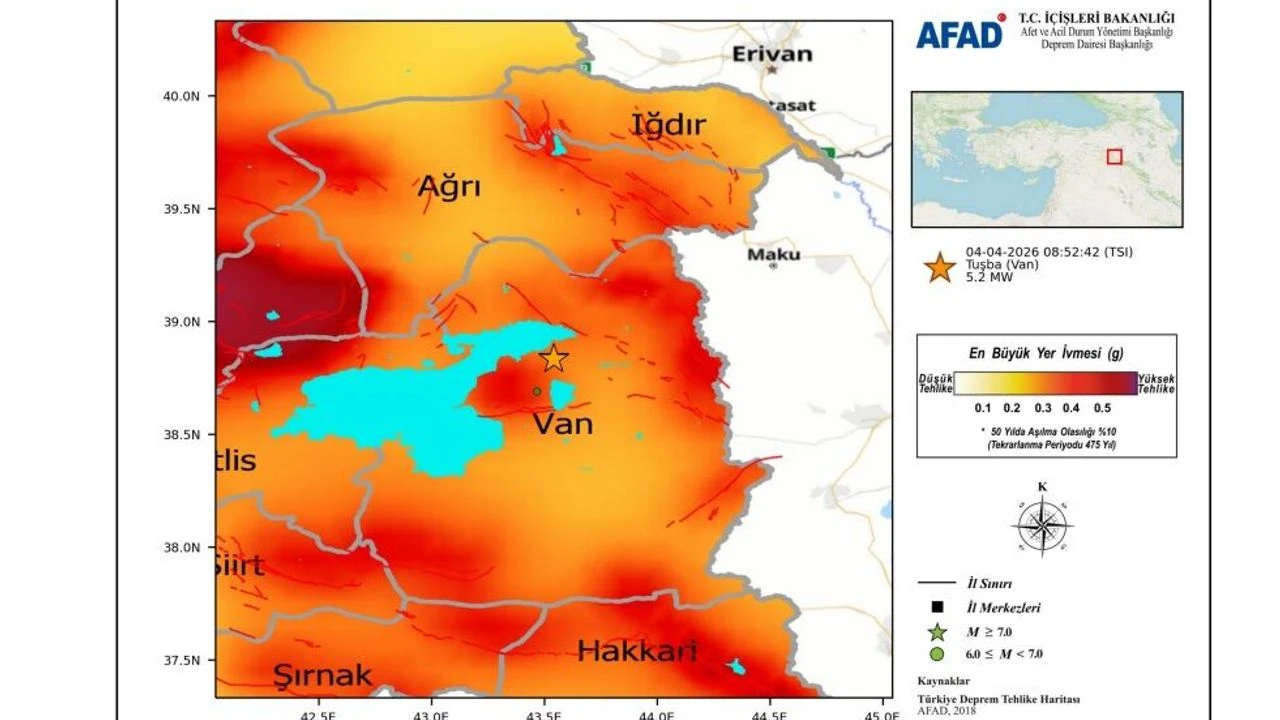 AFAD'ın yayımladığı rapora göre, 4 Nisan'da saat 08.52'de merkez üssü Tuşba olan 5,2 büyüklüğünde sarsıntı kaydedildi.