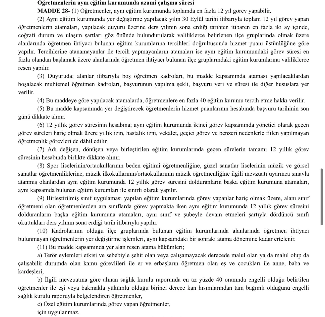 Milli Eğitim Bakanlığı'na Bağlı Öğretmenlerin Atama ve Yer Değiştirme Yönetmeliği' Resmi Gazete'de yayımlanarak yürürlüğe girdi. Düzenlemede yer alan 28. madde ile öğretmenlerin aynı eğitim kurumunda azami çalışma süresine sınırlama getirildi