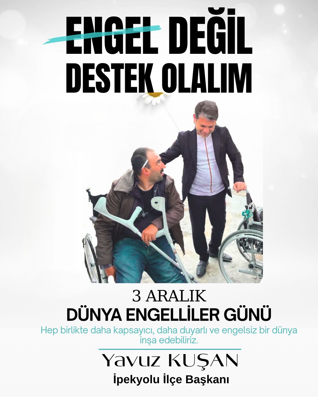 Ak Parti İpekyolu ilçe Başkanı Kuşan 3 Aralık Dünya Engelliler günü Münasebetiyle bir Mesaj yayınladı .Genç Başkan Kuşan mesajında çağdaş bir toplum olmanın gereğinin hiçbir ayrım yapmadan toplumun bütün bireylerine eşit fırsatlar sunmak ve yaşamlarını kolaylaştırıcı düzenlemeler yapmak olduğunu belirterek, Ülke nüfusunun önemli bir bölümünü oluşturan engelli vatandaşlarımızın yaşam kalitesini yükseltmek, bu yönde sağlıklı çalışmalar yaparak ve kalıcı çözümler üreterek bu konuya katkı sunmak, toplum olarak hepimizin sorumluluğudur.