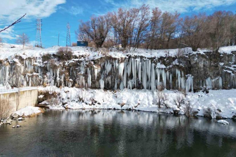 Van’ın Erciş ilçesindeki Koçköprü Kanyonu’nda oluşan metrelerce boydaki buz sarkıtları görsel şölen sunuyor.