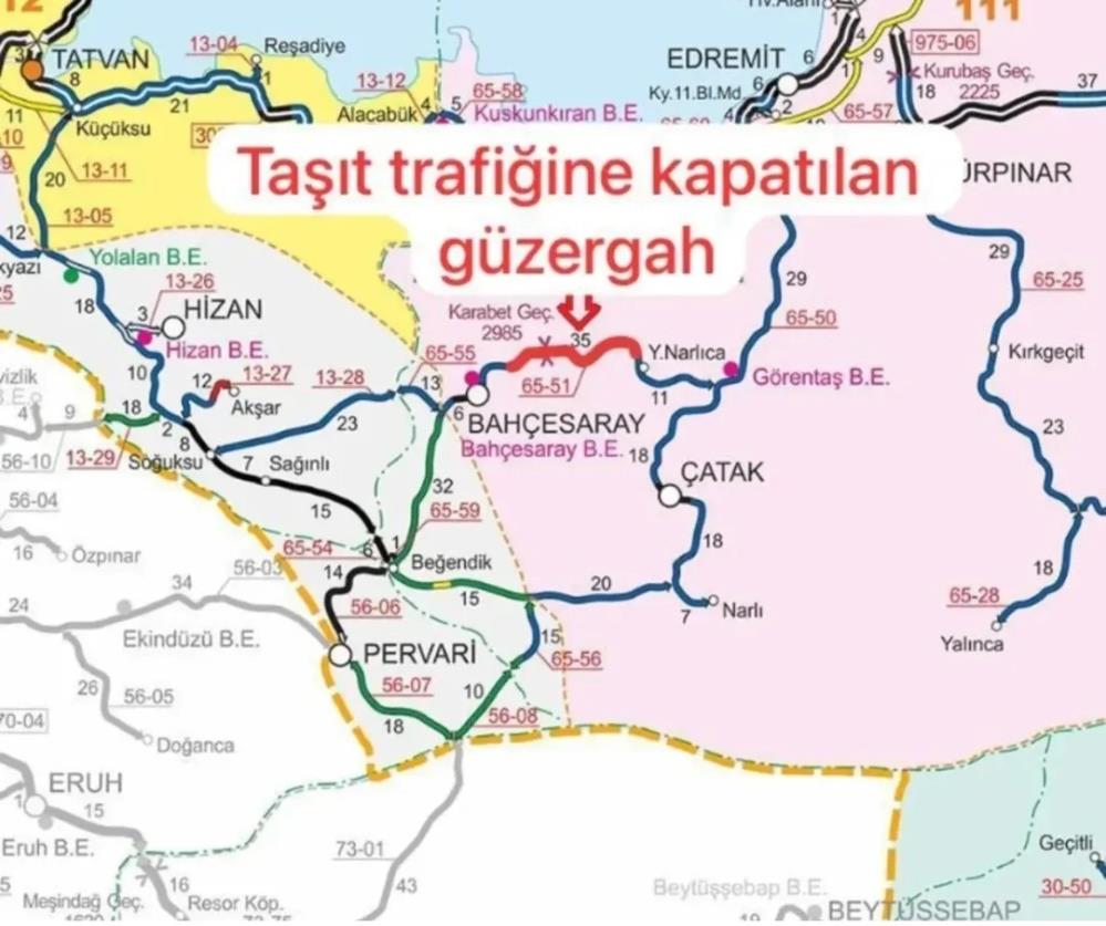 Bahçesaray Kaymakamlığı sosyal medya hesabından yaptığı paylaşımda, "Vatandaşlarımıza duyurulur. Karayolları ekipleri tarafından, yoğun tipi ve görüş mesafesinin yeterli olmaması nedeniyle Bahçesaray’ın Liman Mahallesi ile Çatak ilçesinin Yukarı Narlıca Mahallesi karayolu güzergahı geçici olarak çift yönlü trafiğe kapatılmıştır" ifadelerine yer verildi.