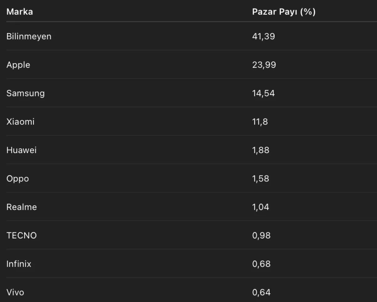 Küresel lider Apple, Türkiye pazarında da güçlü konumunu korurken, Samsung yüzde 14,54 ile ikinci sırada yer aldı. Çinli teknoloji devi Xiaomi ise hızla büyüyen kullanıcı kitlesiyle dikkat çekiyor.