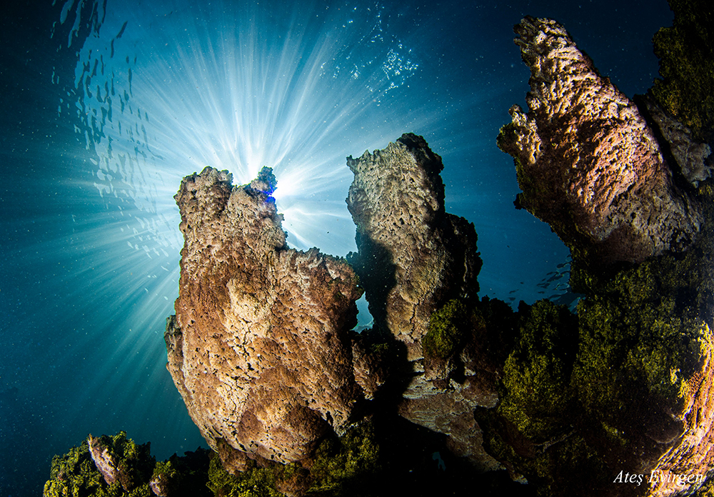 [Fotoğraf: Van Gölü derinliklerinde görüntülenen görkemli mikrobiyalit yapıları]