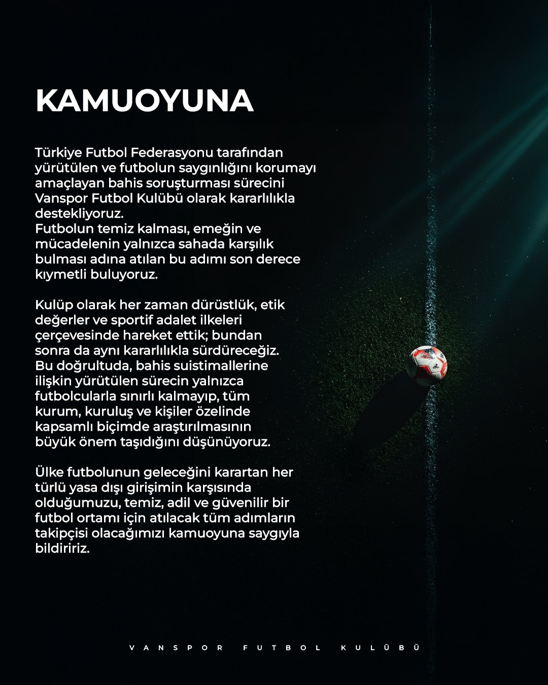 Van Spor’un vurguladığı en kritik nokta ise soruşturmanın kapsamının genişletilmesi talebi oldu. Kulüp, Bahis Suiistimallerine ilişkin yürütülen sürecin sadece futbolcularla sınırlı kalmaması gerektiğini savundu. Açıklamada, "Tüm kurum, kuruluş ve kişiler özelinde kapsamlı biçimde araştırılmasının büyük önem taşıdığını düşünüyoruz," denildi. Van Spor FK, yasa dışı girişimlerin karşısında olduklarını ve adil bir futbol ortamı için atılacak tüm adımların takipçisi olacaklarını kamuoyuna saygıyla duyurdu.