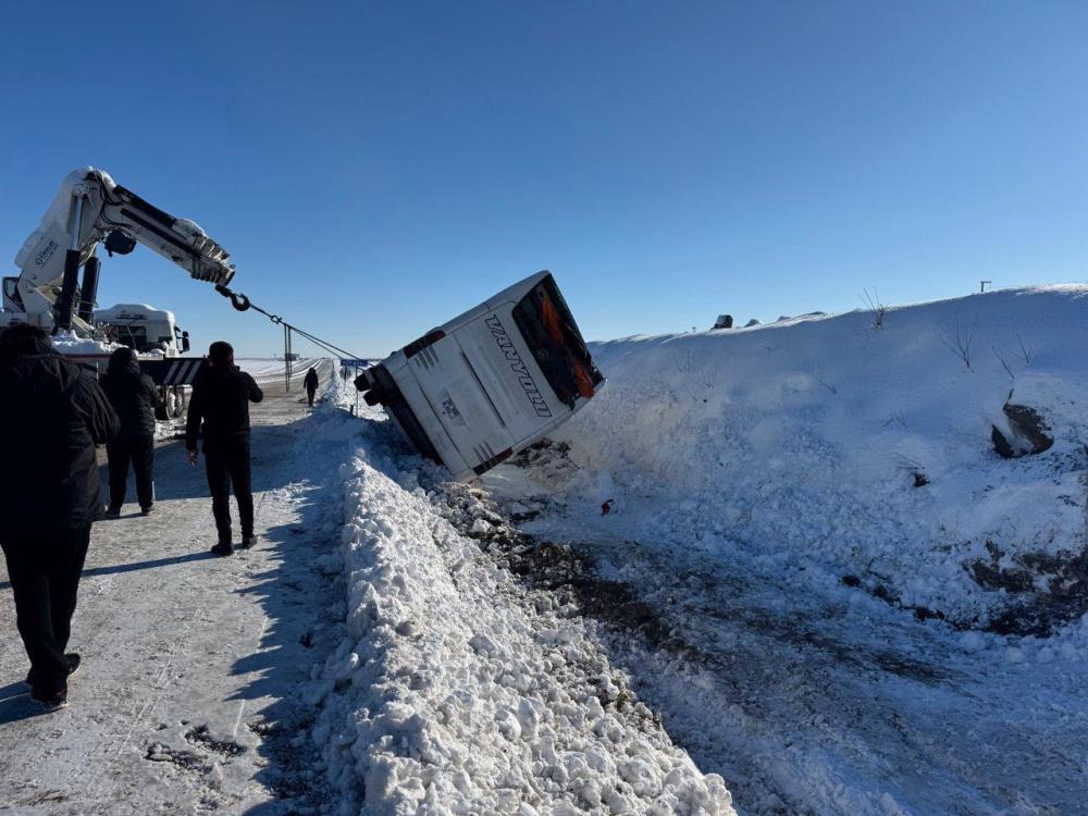 Edinilen bilgilere göre, sabah 03.00 sıralarında ilçenin Övündüler Mahallesi Tokaçlı Küme Evleri mevkiinde Hatay’dan Van’a giden 65 ADD 803 plakalı yolcu otobüsü, kayganlaşan yolda sürücünün direksiyon hakimiyetini kaybetmesi sonucu devrildi.