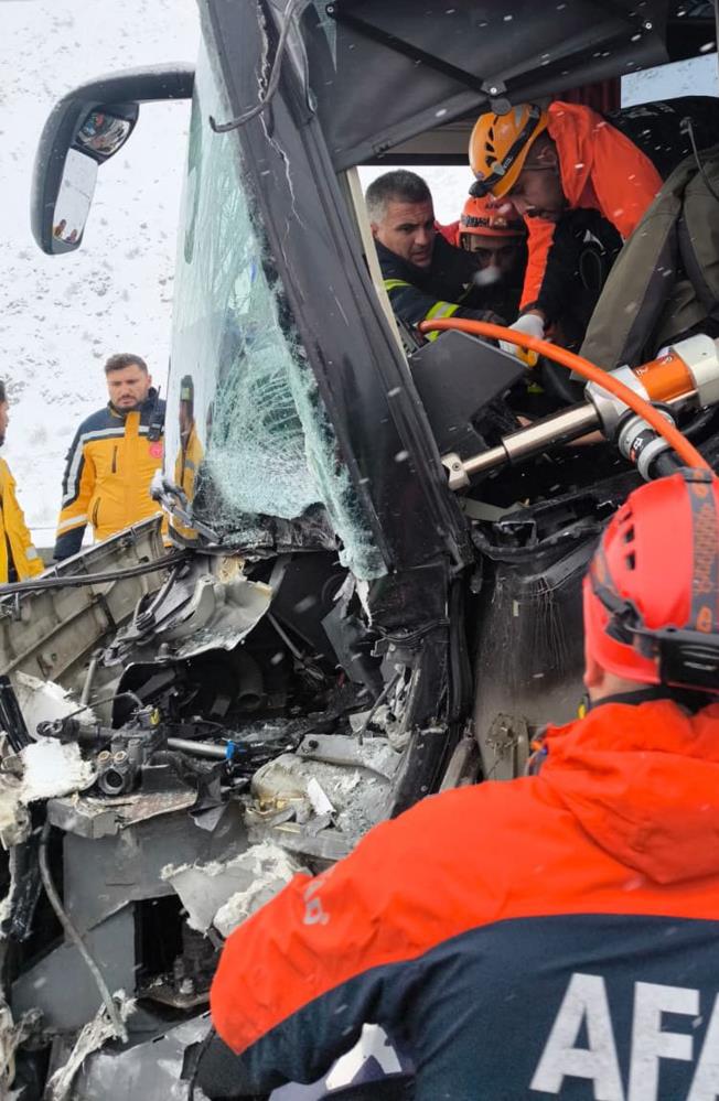 Edinilen bilgiye göre, Marmaris’ten Van’a gitmekte olan L.A. yönetimindeki 16 ABN 493 plakalı yolcu otobüsü, kar yağışı ve olumsuz hava şartlarının etkili olduğu bölgede, önünde seyreden İran plakalı tıra arkadan çarptı.