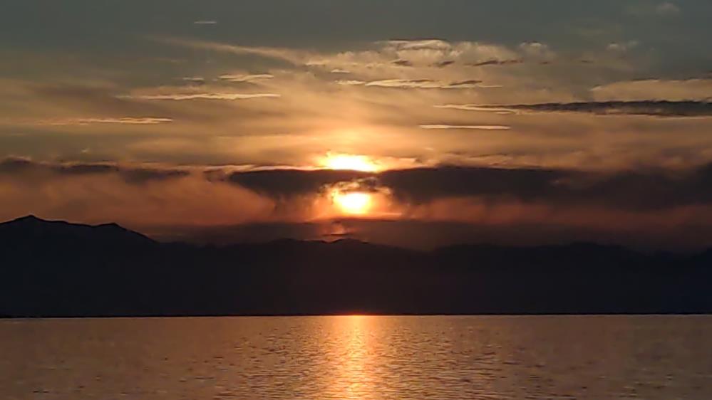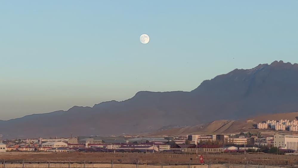 Van'da akşam saatlerinde gökyüzü, batıda gün batımının kızıla boyanmasıyla doğudan yükselen dolunayın gümüşi ışıklarına sahne oldu. İki dev ışık kaynağının eşsiz dansı.