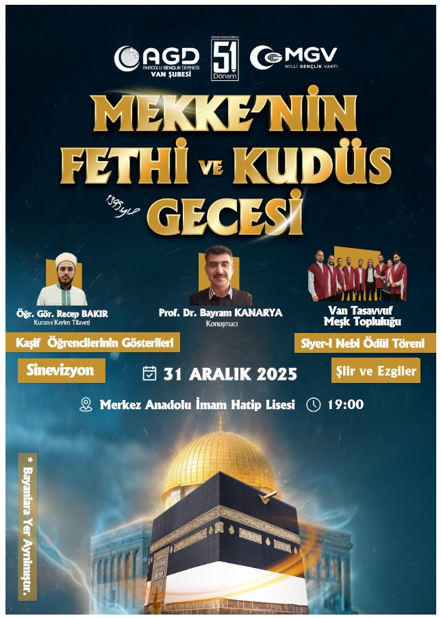 ‘Mekke'nin Fethi ve Kudüs Gecesi’, 31 Aralık 2025 Çarşamba günü saat 19.00'da VanMerkez İmam Hatip Lisesi konferans salonunda gerçekleşecek.