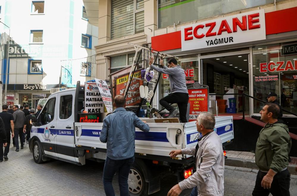 Van Büyükşehir ve İpekyolu Belediyesi zabıta ekipleri, vatandaş şikayetleriyle Cumhuriyet ve Suvaroğlu caddelerinde kaldırım işgallerine el koydu
