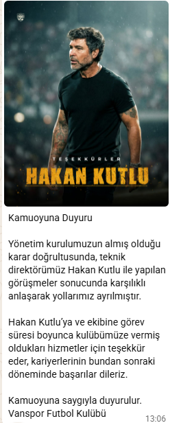 Vanspor Futbol Kulübü’nden yapılan açıklamada, "Yönetim kurulumuzun almış olduğu karar doğrultusunda, teknik direktörümüz Hakan Kutlu ile yapılan görüşmeler sonucunda karşılıklı anlaşarak yollarımız ayrılmıştır. Hakan Kutlu’ya ve ekibine görev süresi boyunca kulübümüze vermiş oldukları hizmetler için teşekkür eder, kariyerlerinin bundan sonraki döneminde başarılar dileriz" denildi.